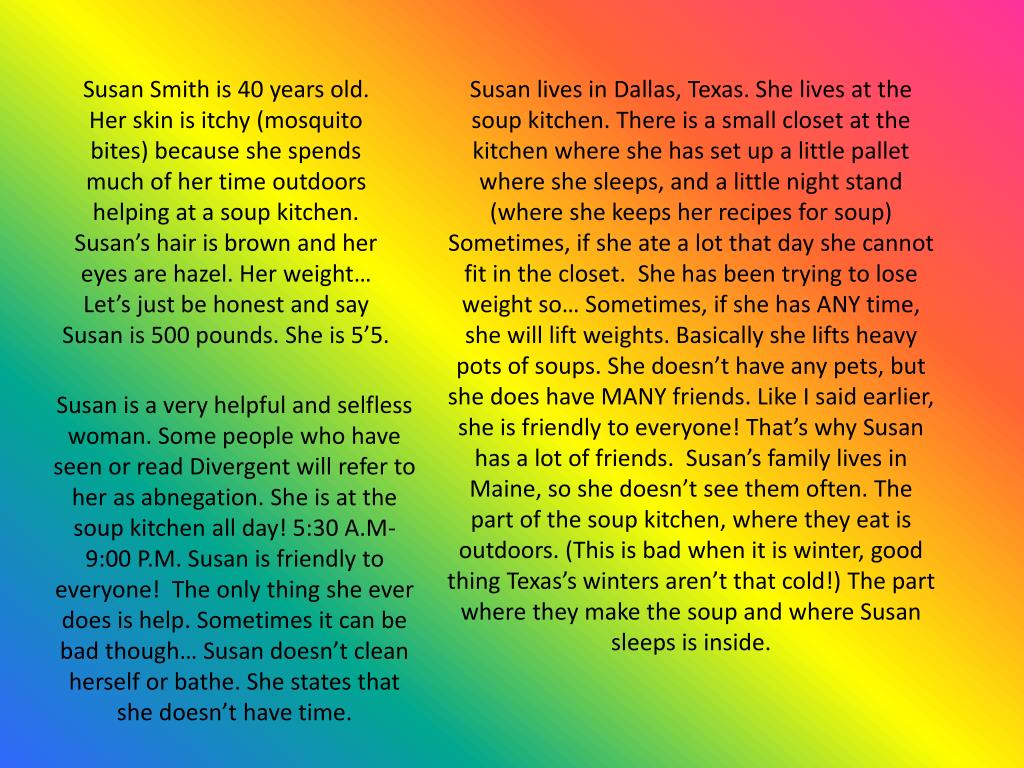 Susan Smith is 40 years old. Her skin is itchy (mosquito bites) because she spends much of her time outdoors helping at a soup kitchen. Susan’s hair is brown and her eyes are hazel. Her weight… Let’s just be honest and say Susan is 500 pounds. She is 5’5. Susan lives in Dallas, Texas. She lives at the soup kitchen. There is a small closet at the kitchen where she has set up a little pallet where she sleeps, and a little night stand (where she keeps her recipes for soup) Sometimes, if she ate a lot that day she cannot fit in the closet. She has been trying to lose weight so… Sometimes, if she has ANY time, she will lift weights. Basically she lifts heavy pots of soups. She doesn’t have any pets, but she does have MANY friends. Like I said earlier, she is friendly to everyone! That’s why Susan has a lot of friends. Susan’s family lives in Maine, so she doesn’t see them often. The part of the soup kitchen, where they eat is outdoors. (This is bad when it is winter, good thing Texas’s winters aren’t that cold!) The part where they make the soup and where Susan sleeps is inside. Susan is a very helpful and selfless woman. Some people who have seen or read Divergent will refer to her as abnegation. She is at the soup kitchen all day! 5:30 A.M- 9:00 P.M. Susan is friendly to everyone! The only thing she ever does is help. Sometimes it can be bad though… Susan doesn’t clean herself or bathe. She states that she doesn’t have time.