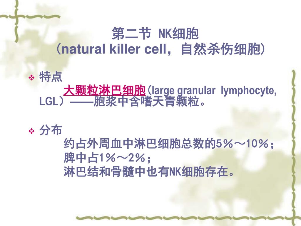 第二节 NK细胞(natural killer cell,自然杀伤细胞) • 特点 大颗粒淋巴细胞(large granularlymphocyte, LGL)——胞浆中含嗜天青颗粒。 • 分布 约占外周血中淋巴细胞总数的5%~10%; 脾中占1%~2%; 淋巴结和骨髓中也有NK细胞存在。