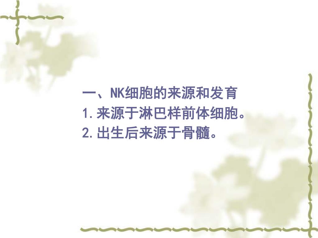 一、NK细胞的来源和发育 1.来源于淋巴样前体细胞。 2.出生后来源于骨髓。