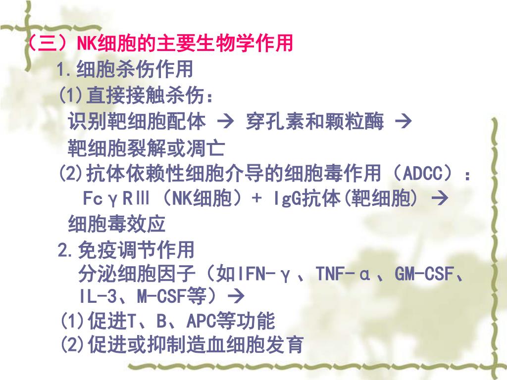 (三)NK细胞的主要生物学作用 1.细胞杀伤作用 (1)直接接触杀伤: 识别靶细胞配体 穿孔素和颗粒酶 靶细胞裂解或凋亡 (2)抗体依赖性细胞介导的细胞毒作用(ADCC): FcγRⅢ(NK细胞)+ IgG抗体(靶细胞) 细胞毒效应 2.免疫调节作用 分泌细胞因子(如IFN-γ、TNF-α、GM-CSF、 IL-3、M-CSF等) (1)促进T、B、APC等功能 (2)促进或抑制造血细胞发育
