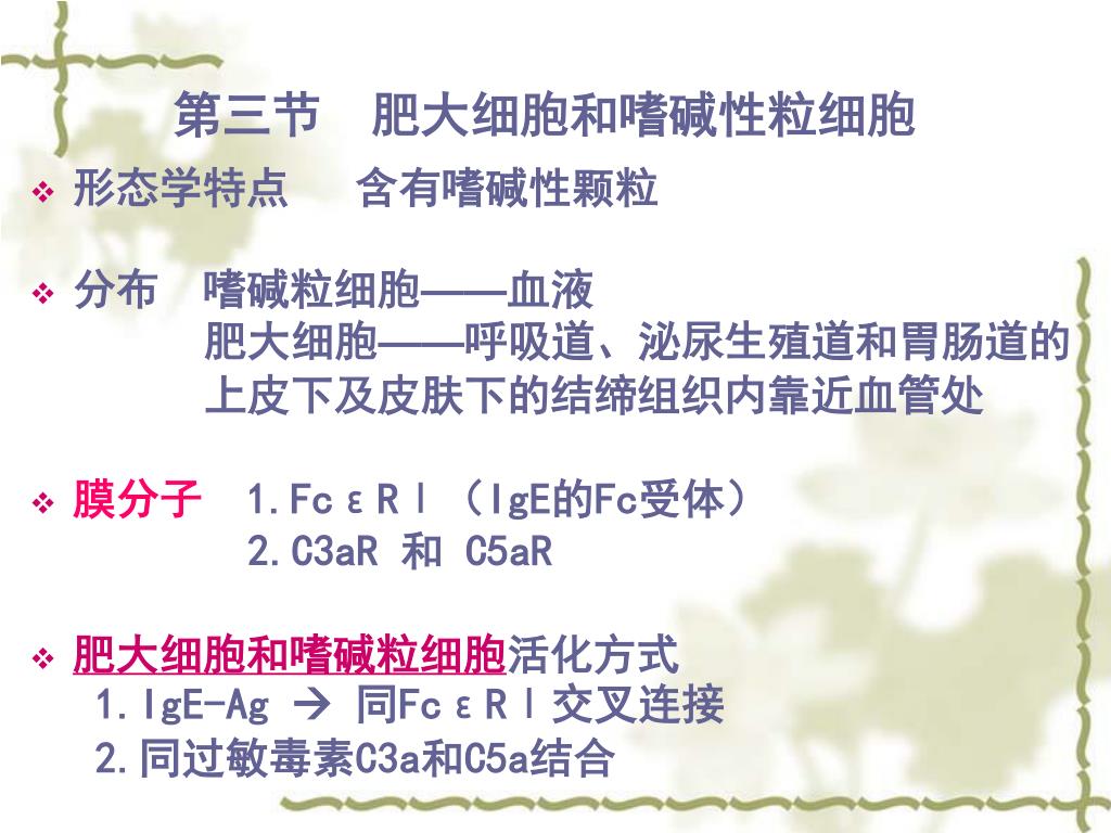 第三节 肥大细胞和嗜碱性粒细胞 • 形态学特点 含有嗜碱性颗粒 • 分布 嗜碱粒细胞——血液 肥大细胞——呼吸道、泌尿生殖道和胃肠道的 上皮下及皮肤下的结缔组织内靠近血管处 • 膜分子1.FcεRⅠ(IgE的Fc受体) 2.C3aR 和 C5aR • 肥大细胞和嗜碱粒细胞活化方式 1.IgE-Ag 同FcεRⅠ交叉连接 2.同过敏毒素C3a和C5a结合