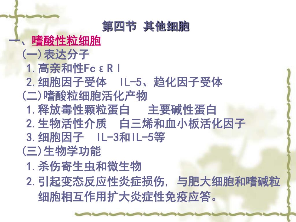 第四节 其他细胞 一、嗜酸性粒细胞 (一)表达分子 1.高亲和性FcεRⅠ 2.细胞因子受体 IL-5、趋化因子受体 (二)嗜酸粒细胞活化产物 1.释放毒性颗粒蛋白 主要碱性蛋白 2.生物活性介质 白三烯和血小板活化因子 3.细胞因子 IL-3和IL-5等 (三)生物学功能 1.杀伤寄生虫和微生物 2.引起变态反应性炎症损伤, 与肥大细胞和嗜碱粒 细胞相互作用扩大炎症性免疫应答。