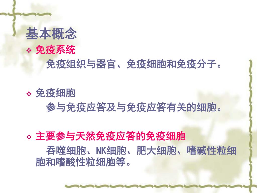 基本概念 • 免疫系统 免疫组织与器官、免疫细胞和免疫分子。 • 免疫细胞 参与免疫应答及与免疫应答有关的细胞。 • 主要参与天然免疫应答的免疫细胞 吞噬细胞、NK细胞、肥大细胞、嗜碱性粒细胞和嗜酸性粒细胞等。
