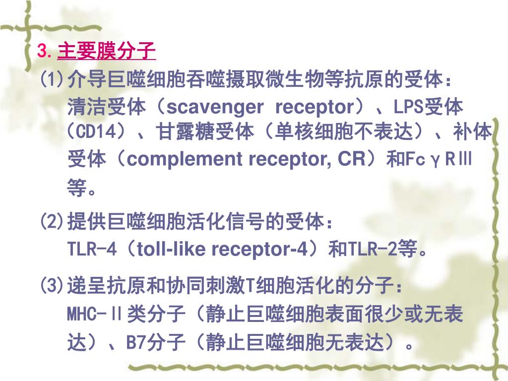 3.主要膜分子 (1)介导巨噬细胞吞噬摄取微生物等抗原的受体: 清洁受体(scavenger receptor)、LPS受体(CD14)、甘露糖受体(单核细胞不表达)、补体 受体(complement receptor, CR)和FcγRⅢ 等。 (2)提供巨噬细胞活化信号的受体: TLR-4(toll-like receptor-4)和TLR-2等。 (3)递呈抗原和协同刺激T细胞活化的分子: MHC-Ⅱ类分子(静止巨噬细胞表面很少或无表 达)、B7分子(静止巨噬细胞无表达)。