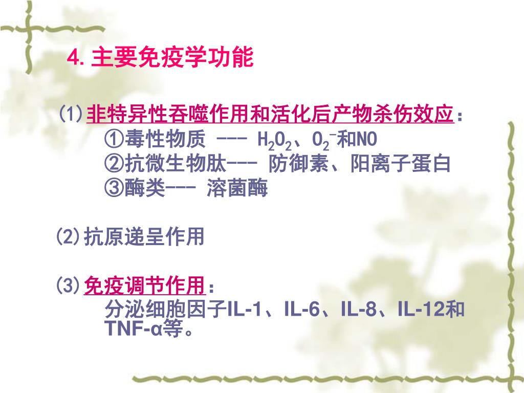 4.主要免疫学功能 (1)非特异性吞噬作用和活化后产物杀伤效应: ①毒性物质 --- H2O2、O2-和NO ②抗微生物肽--- 防御素、阳离子蛋白 ③酶类--- 溶菌酶 (2)抗原递呈作用 (3)免疫调节作用: 分泌细胞因子IL-1、IL-6、IL-8、IL-12和TNF-α等。