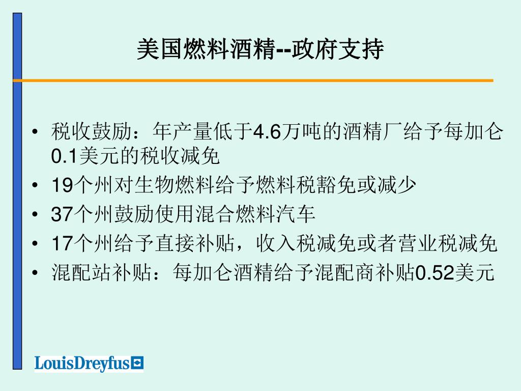 美国燃料酒精--政府支持 • 税收鼓励:年产量低于4.6万吨的酒精厂给予每加仑0.1美元的税收减免 • 19个州对生物燃料给予燃料税豁免或减少 • 37个州鼓励使用混合燃料汽车 • 17个州给予直接补贴,收入税减免或者营业税减免 • 混配站补贴:每加仑酒精给予混配商补贴0.52美元