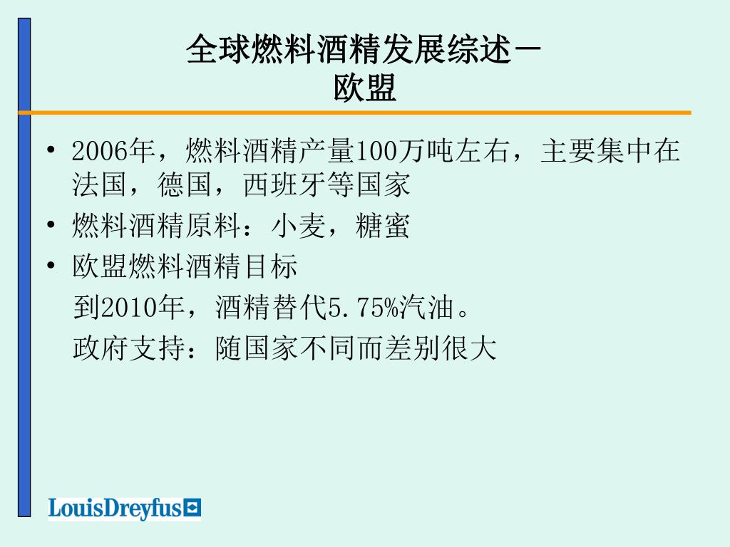 全球燃料酒精发展综述-欧盟 • 2006年,燃料酒精产量100万吨左右,主要集中在法国,德国,西班牙等国家 • 燃料酒精原料:小麦,糖蜜 • 欧盟燃料酒精目标 到2010年,酒精替代5.75%汽油。 政府支持:随国家不同而差别很大