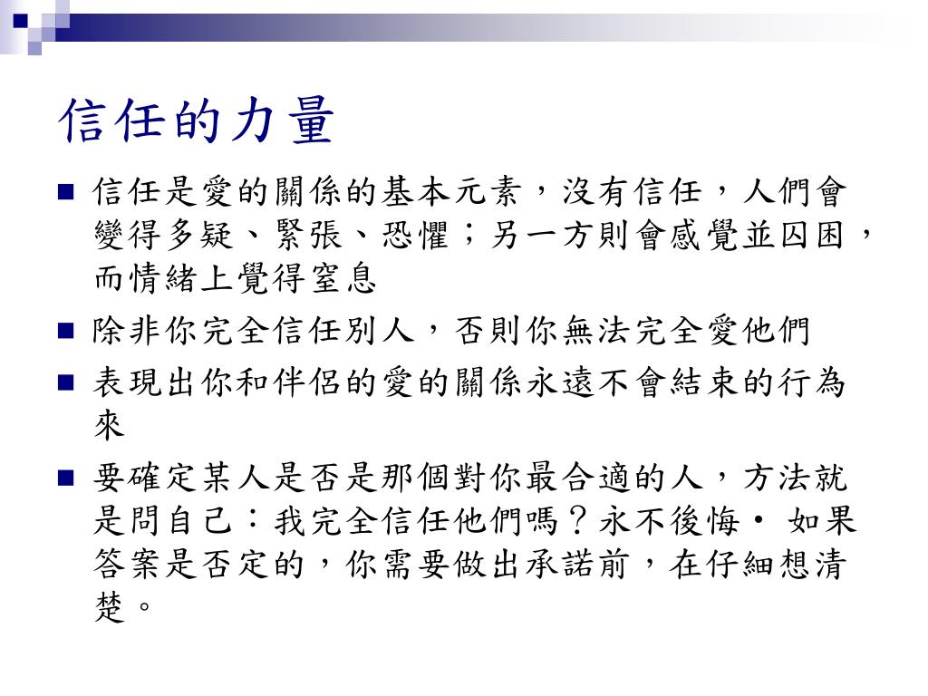 信任的力量 • 信任是愛的關係的基本元素,沒有信任,人們會變得多疑、緊張、恐懼;另一方則會感覺並囚困,而情緒上覺得窒息 • 除非你完全信任別人,否則你無法完全愛他們 • 表現出你和伴侶的愛的關係永遠不會結束的行為來 • 要確定某人是否是那個對你最合適的人,方法就是問自己:我完全信任他們嗎?永不後悔‧如果答案是否定的,你需要做出承諾前,在仔細想清楚。