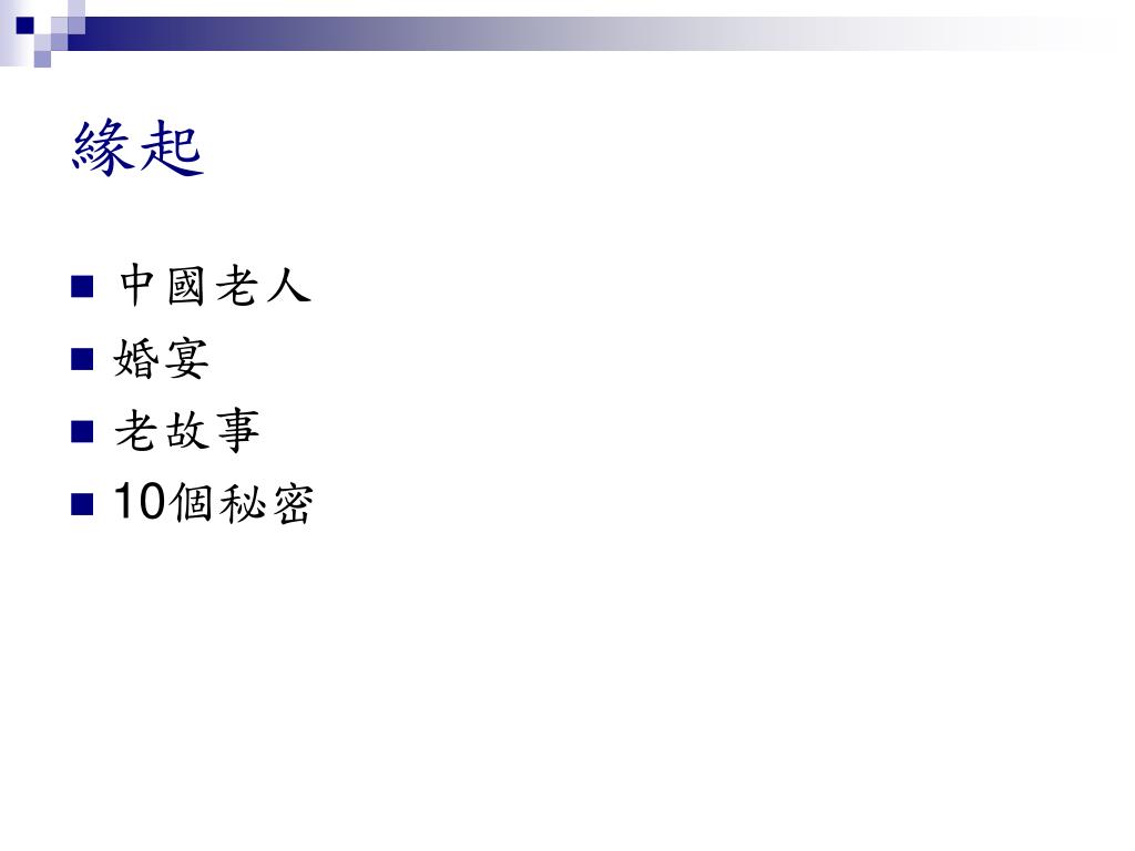 緣起 • 中國老人 • 婚宴 • 老故事 • 10個秘密