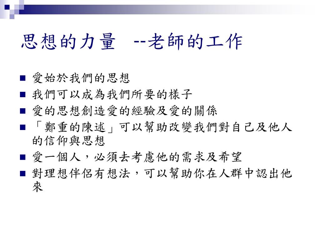 思想的力量 --老師的工作 • 愛始於我們的思想 • 我們可以成為我們所要的樣子 • 愛的思想創造愛的經驗及愛的關係 • 「鄭重的陳述」可以幫助改變我們對自己及他人的信仰與思想 • 愛一個人,必須去考慮他的需求及希望 • 對理想伴侶有想法,可以幫助你在人群中認出他來