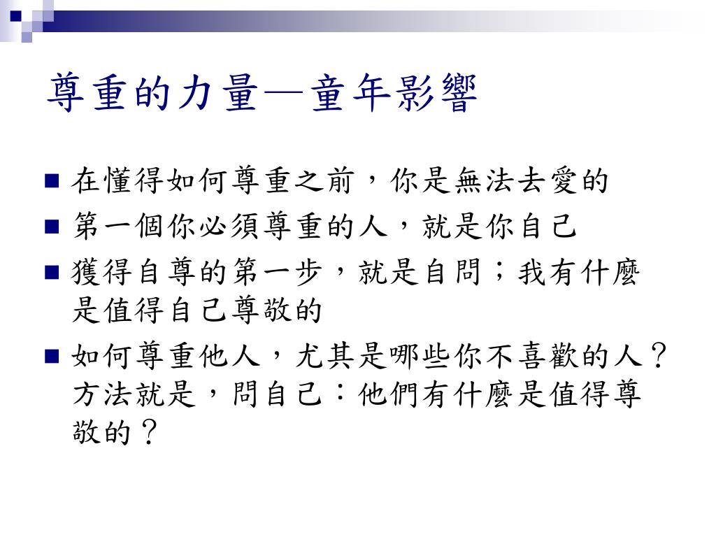 尊重的力量—童年影響 • 在懂得如何尊重之前,你是無法去愛的 • 第一個你必須尊重的人,就是你自己 • 獲得自尊的第一步,就是自問;我有什麼是值得自己尊敬的 • 如何尊重他人,尤其是哪些你不喜歡的人?方法就是,問自己:他們有什麼是值得尊敬的?