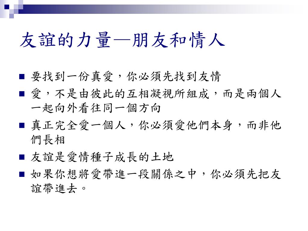 友誼的力量—朋友和情人 • 要找到一份真愛,你必須先找到友情 • 愛,不是由彼此的互相凝視所組成,而是兩個人一起向外看往同一個方向 • 真正完全愛一個人,你必須愛他們本身,而非他們長相 • 友誼是愛情種子成長的土地 • 如果你想將愛帶進一段關係之中,你必須先把友誼帶進去。