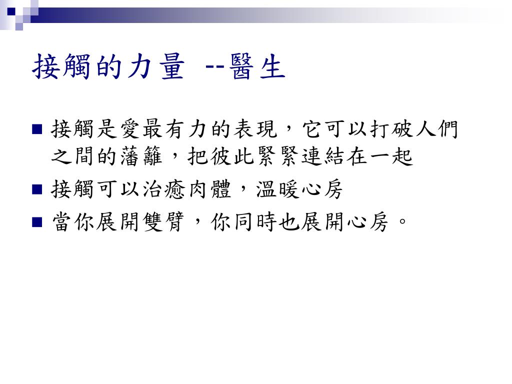 接觸的力量 --醫生 • 接觸是愛最有力的表現,它可以打破人們之間的藩籬,把彼此緊緊連結在一起 • 接觸可以治癒肉體,溫暖心房 • 當你展開雙臂,你同時也展開心房。