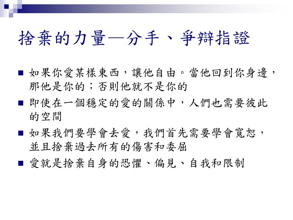 捨棄的力量—分手、爭辯指證 • 如果你愛某樣東西,讓他自由。當他回到你身邊,那他是你的;否則他就不是你的 • 即使在一個穩定的愛的關係中,人們也需要彼此的空間 • 如果我們要學會去愛,我們首先需要學會寬恕,並且捨棄過去所有的傷害和委屈 • 愛就是捨棄自身的恐懼、偏見、自我和限制