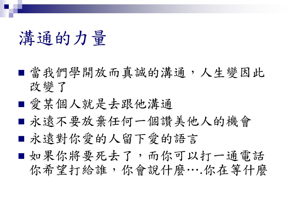 溝通的力量 • 當我們學開放而真誠的溝通,人生變因此改變了 • 愛某個人就是去跟他溝通 • 永遠不要放棄任何一個讚美他人的機會 • 永遠對你愛的人留下愛的語言 • 如果你將要死去了,而你可以打一通電話你希望打給誰,你會說什麼….你在等什麼