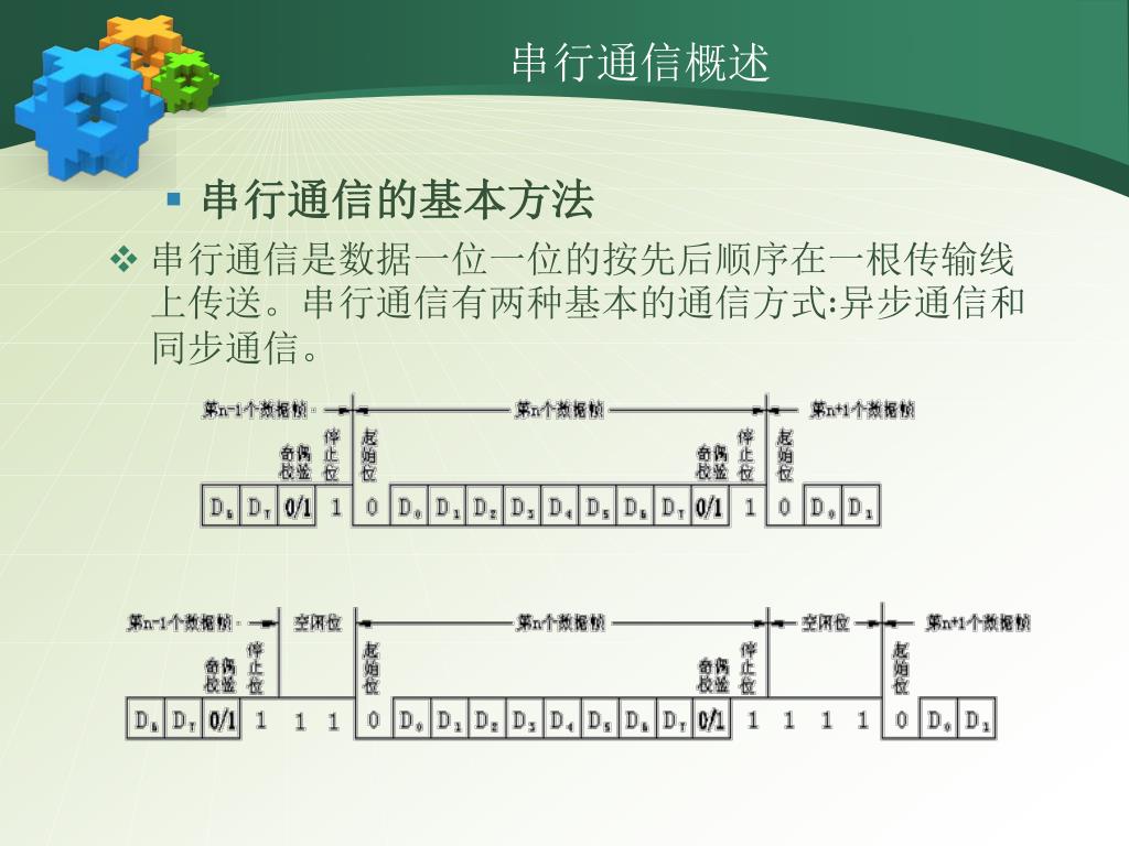 串行通信概述 • 串行通信的基本方法 • 串行通信是数据一位一位的按先后顺序在一根传输线上传送。串行通信有两种基本的通信方式∶异步通信和同步通信。