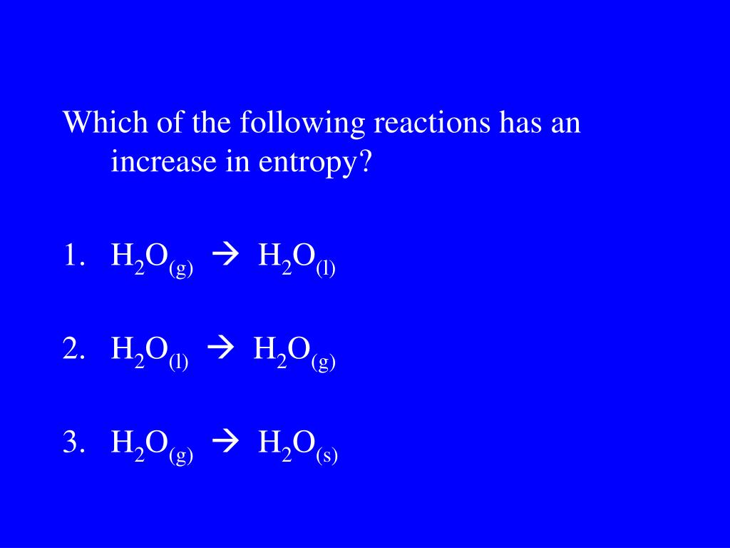 Which of the following reactions has an increase in entropy? • H2O(g) H2O(l) • H2O(l) H2O(g) • H2O(g) H2O(s)