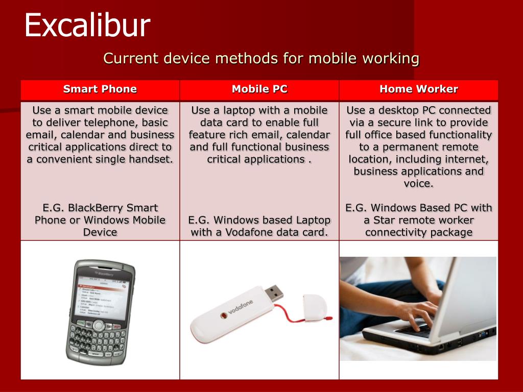 Excalibur Communications. Paul Crow Corporate Sales Manager. Mobile Working. Excalibur. Past Present The future?. Excalibur. Very Quick History lesson. Excalibur. 1985 saw the introduction of car and transportable phones. Excalibur.