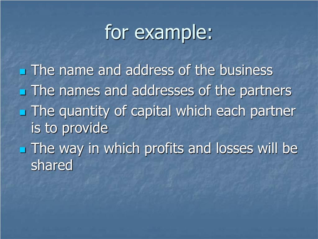 for example: • The name and address of the business • The names and addresses of the partners • The quantity of capital which each partner is to provide • The way in which profits and losses will be shared