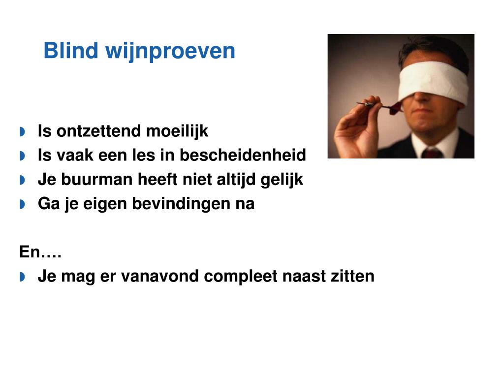 Blind wijnproeven • Is ontzettend moeilijk • Is vaak een les in bescheidenheid • Je buurman heeft niet altijd gelijk • Ga je eigen bevindingen na En…. • Je mag er vanavond compleet naast zitten