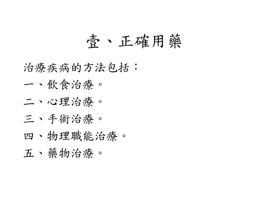 壹、正確用藥 治療疾病的方法包括: 一、飲食治療。 二、心理治療。 三、手術治療。 四、物理職能治療。 五、藥物治療。