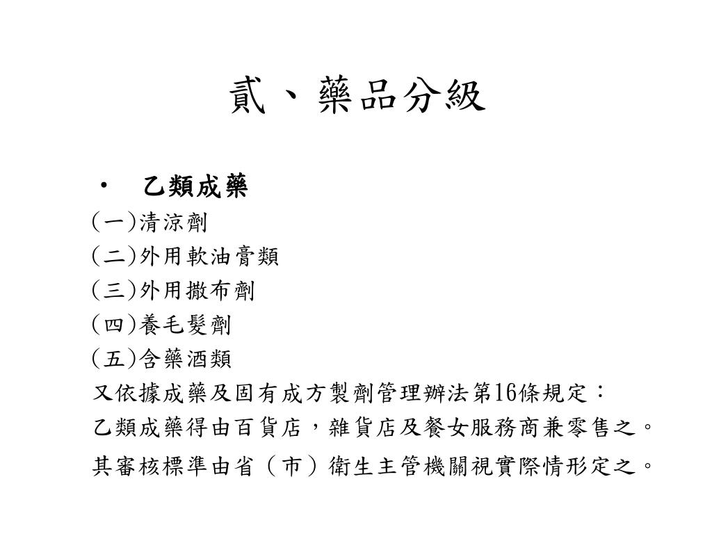 貳、藥品分級 • 乙類成藥 (一)清涼劑 (二)外用軟油膏類 (三)外用撒布劑 (四)養毛髮劑 (五)含藥酒類 又依據成藥及固有成方製劑管理辦法第16條規定: 乙類成藥得由百貨店,雜貨店及餐女服務商兼零售之。 其審核標準由省(市)衛生主管機關視實際情形定之。
