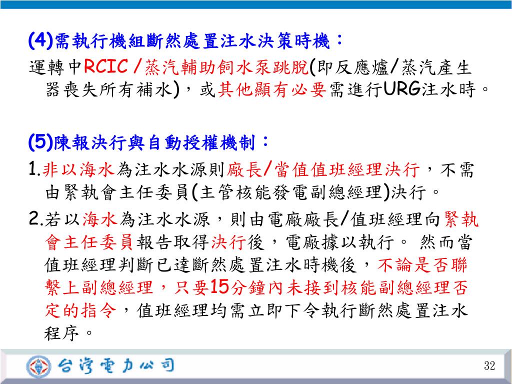台電公司沸水式核能電廠機組斷然處置執行及通報流程台電公司沸水式核能電廠機組斷然處置執行及通報流程 啟動斷然處置設備列置程序之條件 通報狀況一 條件三 強震急停,且 海嘯警報發佈 條件一 喪失蒸汽驅動補水系統以外之電力驅動反應爐補水能力 條件二 喪失所有交流電源(包括廠外、廠內EDG、第五台EDG、氣渦輪發電機等原固定式電源) 或 或 啟動斷然處置設備列置程序 目的:不能讓核燃料熔損,輻射外洩。避免大規模民眾疏散 同時 斷然處置注水前設備列置完成 通報狀況二 列置、準備注水 反應爐流徑 列置、準備反應爐降壓 列置、準備圍阻體連通大氣環境 避免反應爐內 高壓力造成 水無法注入 避免圍阻體背壓過高,造成水無法注入反應爐/移除圍阻體熱量/避免氫爆 注水流徑-1 生水池重力注水 注水流徑-2 消防車/消防泵注水 條件一或條件二 通報 狀況三 遭受海嘯侵襲而造成條件一或條件二之狀況 或 通報狀況四(注海水需陳報) 若非以海水為注水水源則廠長/當值值班經理決行,不需由緊急計畫執行委員會主任委員(主管核能發電副總經理)決行 斷然處置注水決策 否 注水決策 EOP 若以海水為注水水源,則需向緊急計畫執行委員會主任委員報告。然而只要15分鐘內未接到核能副總經理否定的指令,不論是否聯繫上副總經理,值班經理需立即下令注海水 是 注水行動執行後 通報 狀況五 執行圍阻體排氣、反應爐緊急洩壓、注水行動 維持反應爐核燃料覆蓋水位 使命必達