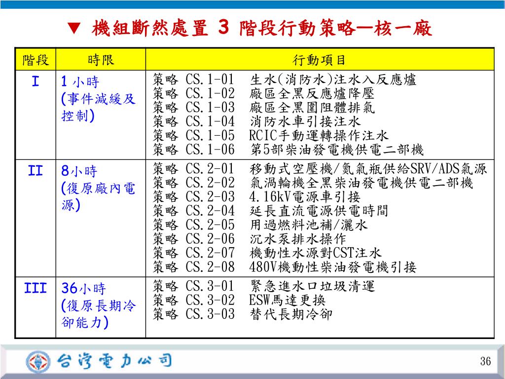 *斷然處置之關鍵階段---第1階段 第1 階段注水設備列置完畢,並不代表就需引動斷然處置注水。只要原運轉中之蒸汽推動補水設備持續運轉短時間內就無須切換至斷然處置低壓注水。 不論是以上何種注水方式均已可長時間維持反應爐安全。而此時第2、3階段行動將持續進行中,直到穩定、可靠之救援設備恢復,反應爐將逐漸遠離危險。