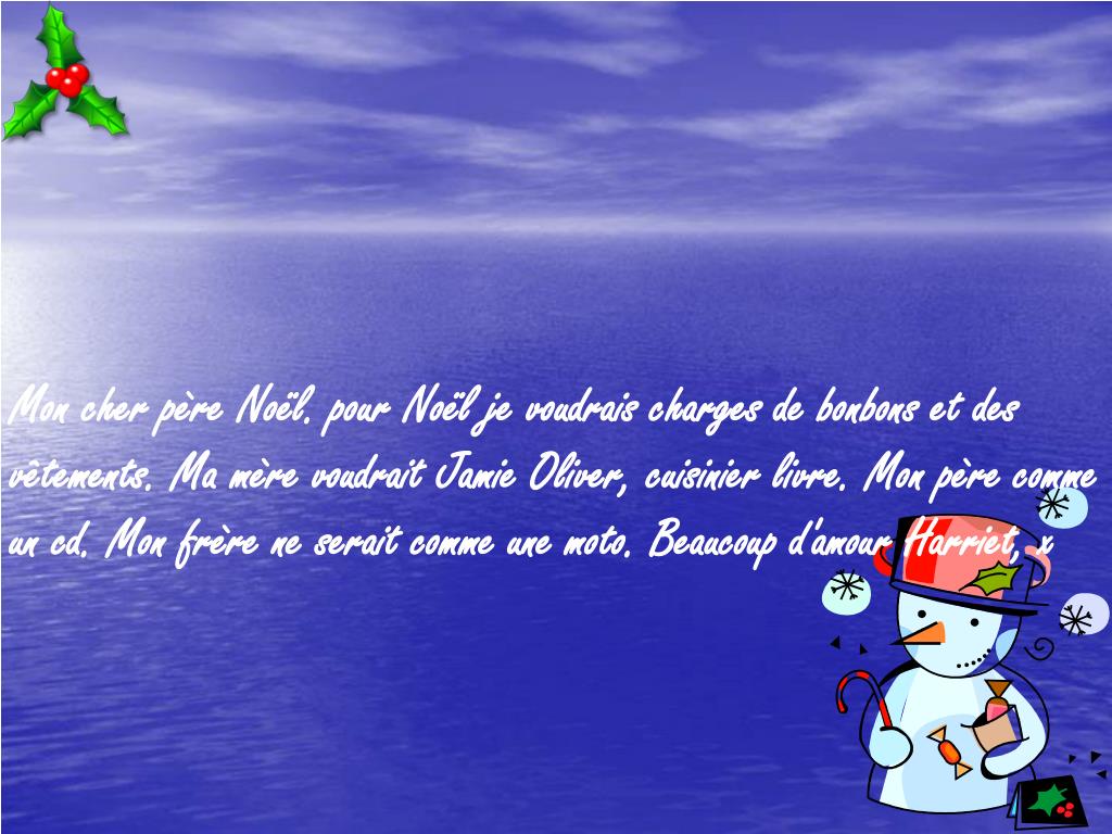 Mon cher père Noël. pour Noël je voudrais charges de bonbons et des vêtements. Ma mère voudrait Jamie Oliver, cuisinier livre. Mon père comme un cd. Mon frère ne serait comme une moto. Beaucoup d'amour Harriet, x
