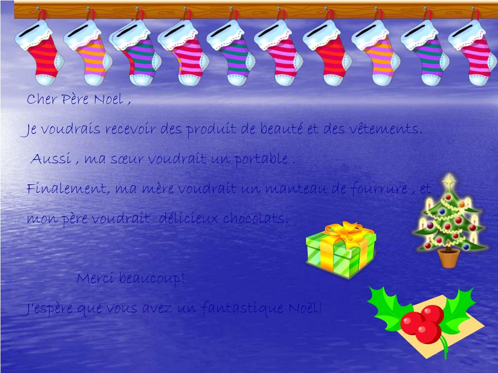 Cher Père Noel , Je voudrais recevoir des produit de beauté et des vêtements. Aussi , ma sœur voudrait un portable . Finalement, ma mère voudrait un manteau de fourrure , et mon père voudrait délicieux chocolats. Merci beaucoup! J'espère que vous avez un fantastique Noël!