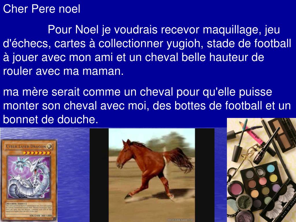 Cher Pere noel Pour Noel je voudrais recevor maquillage, jeu d'échecs, cartes à collectionner yugioh, stade de football à jouer avec mon ami et un cheval belle hauteur de rouler avec ma maman. ma mère serait comme un cheval pour qu'elle puisse monter son cheval avec moi, des bottes de football et un bonnet de douche.