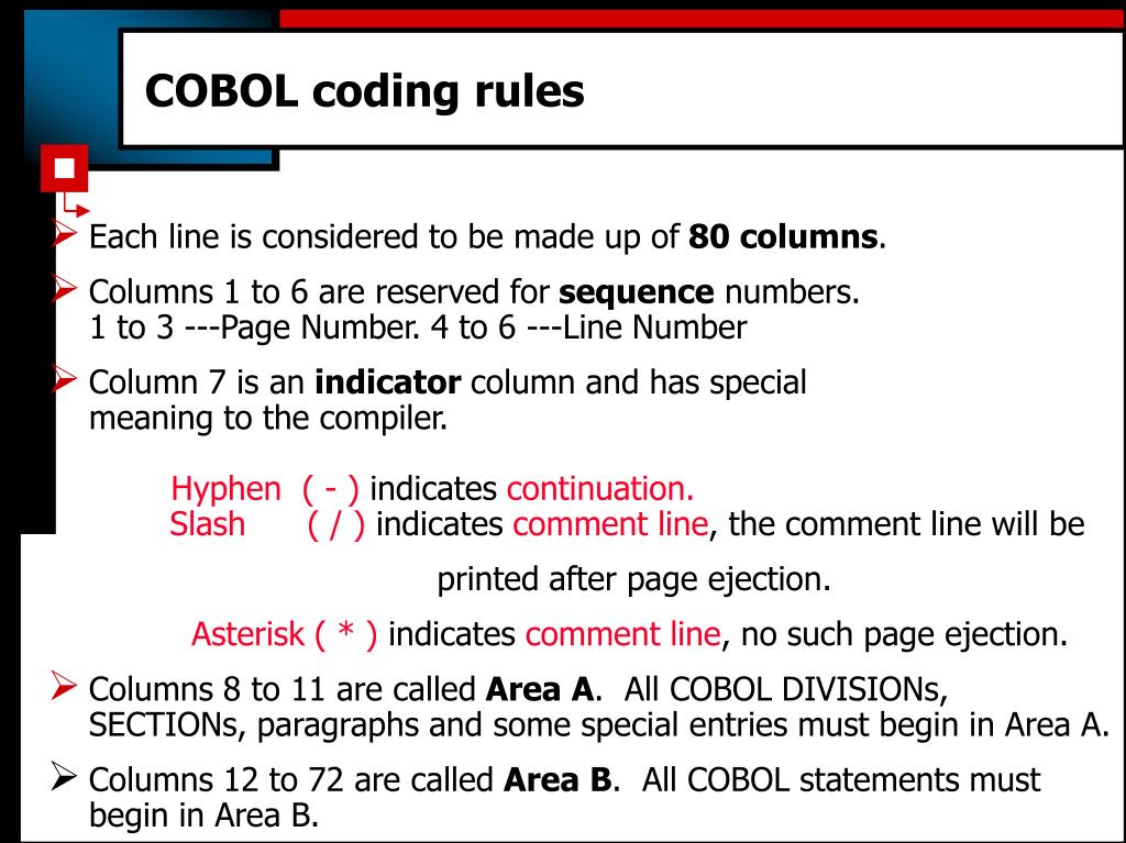 COBOL coding rules • Each line is considered to be made up of 80 columns. • Columns 1 to 6 are reserved for sequence numbers.1 to 3 ---Page Number. 4 to 6 ---Line Number • Column 7 is an indicator column and has specialmeaning to the compiler.Hyphen ( - ) indicates continuation. Slash ( / ) indicates comment line, the comment line will be printed after page ejection. Asterisk ( * ) indicates comment line, no such page ejection. • Columns 8 to 11 are called Area A. All COBOL DIVISIONs, SECTIONs, paragraphs and some special entries must begin in Area A. • Columns 12 to 72 are called Area B. All COBOL statements must begin in Area B.