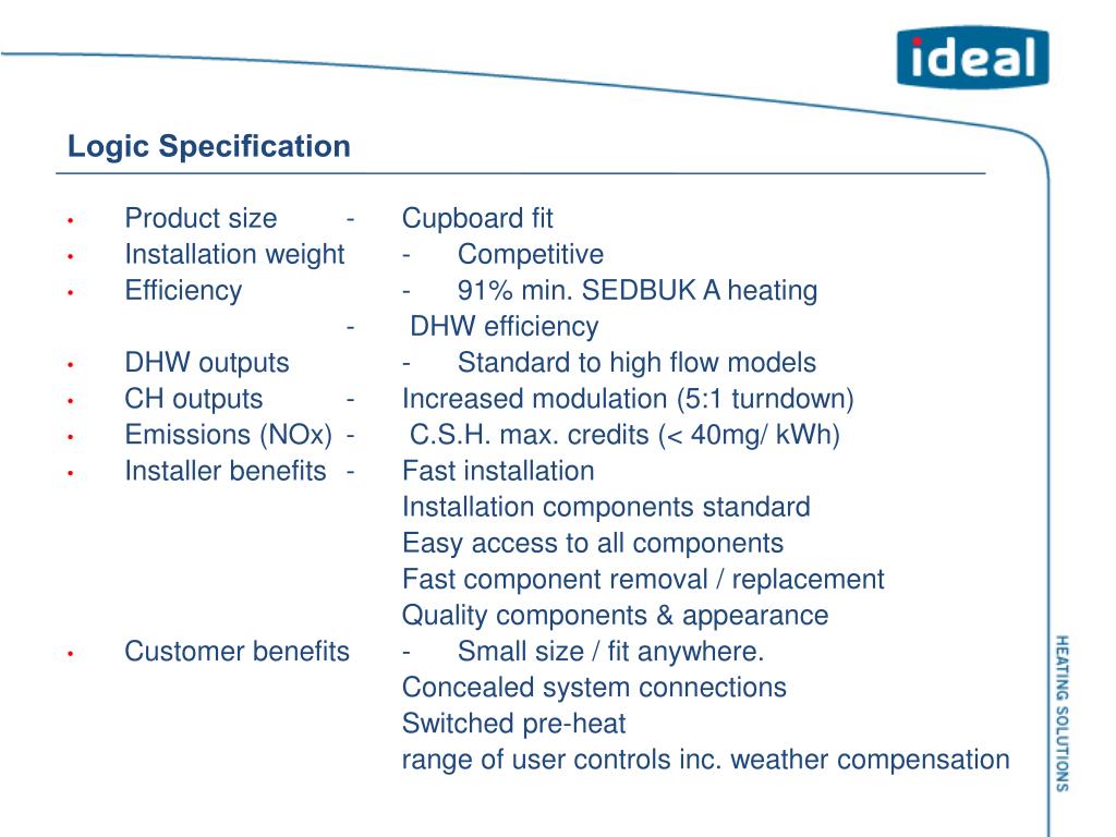 Logic Specification Product size - Cupboard fit Installation weight - Competitive Efficiency - 91% min. SEDBUK A heating - DHW efficiency DHW outputs - Standard to high flow models CH outputs - Increased modulation (5:1 turndown) Emissions (NOx) - C.S.H. max. credits (< 40mg/ kWh) Installer benefits - Fast installation Installation components standard Easy access to all components Fast component removal / replacement Quality components & appearance Customer benefits - Small size / fit anywhere. Concealed system connections Switched pre-heat range of user controls inc. weather compensation