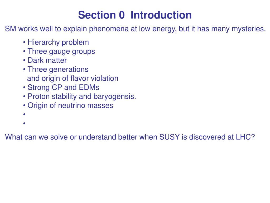 SM works well to explain phenomena at low energy, but it has many mysteries. What can we solve or understand better when SUSY is discovered at LHC? Section 0 Introduction • Hierarchy problem • Three gauge groups • Dark matter • Three generations • and origin of flavor violation • Strong CP and EDMs • Proton stability and baryogensis. • Origin of neutrino masses