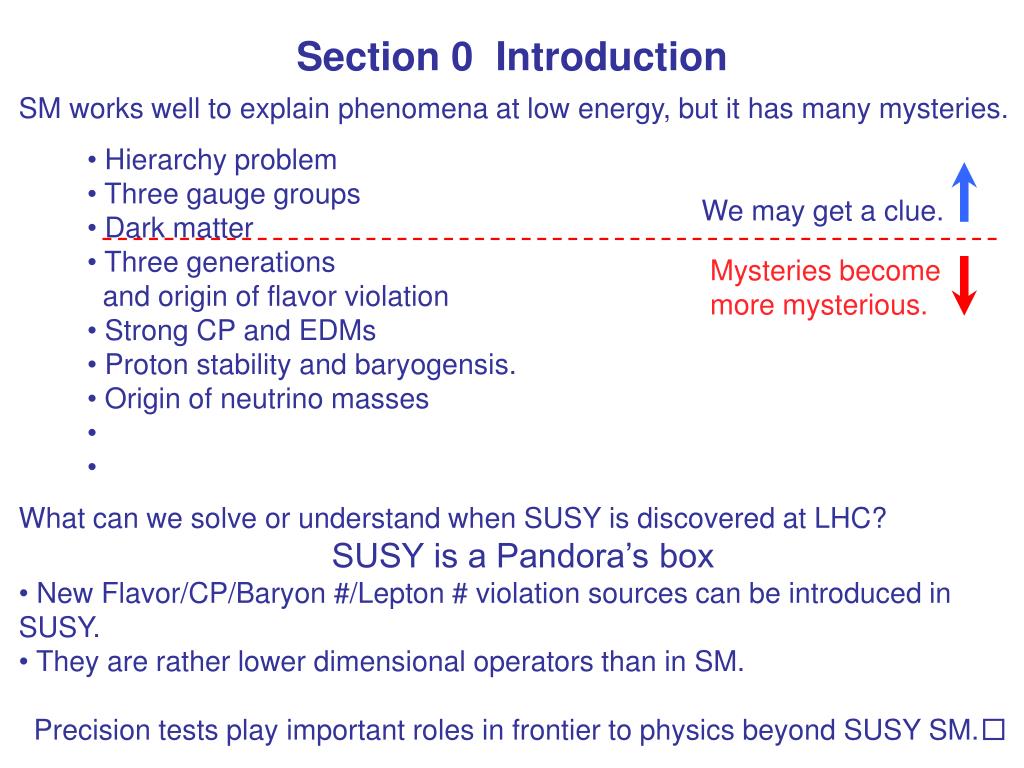 SM works well to explain phenomena at low energy, but it has many mysteries. • What can we solve or understand when SUSY is discovered at LHC? • SUSY is a Pandora’s box • New Flavor/CP/Baryon #/Lepton # violation sources can be introduced in SUSY. • They are rather lower dimensional operators than in SM. Section 0 Introduction • Hierarchy problem • Three gauge groups • Dark matter • Three generations • and origin of flavor violation • Strong CP and EDMs • Proton stability and baryogensis. • Origin of neutrino masses We may get a clue. Mysteries become more mysterious. Precision tests play important roles in frontier to physics beyond SUSY SM.