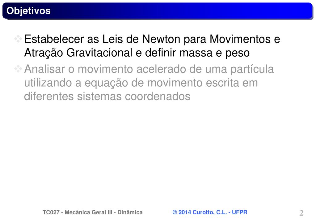 Objetivos • Estabelecer as Leis de Newton para Movimentos e Atração Gravitacional e definir massa e peso • Analisar o movimento acelerado de uma partícula utilizando a equação de movimento escrita em diferentes sistemas coordenados
