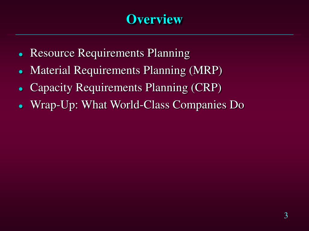 Overview • Resource Requirements Planning • Material Requirements Planning (MRP) • Capacity Requirements Planning (CRP) • Wrap-Up: What World-Class Companies Do