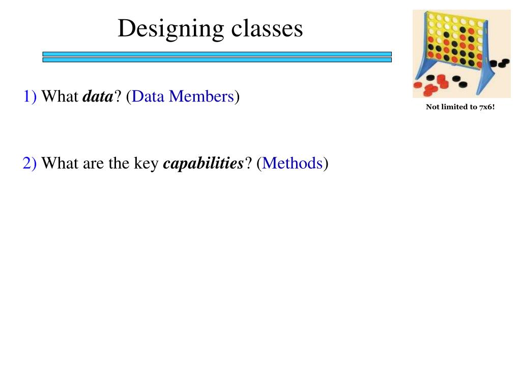 Designing classes 1) What data? (Data Members) Not limited to 7x6! 2) What are the key capabilities? (Methods)