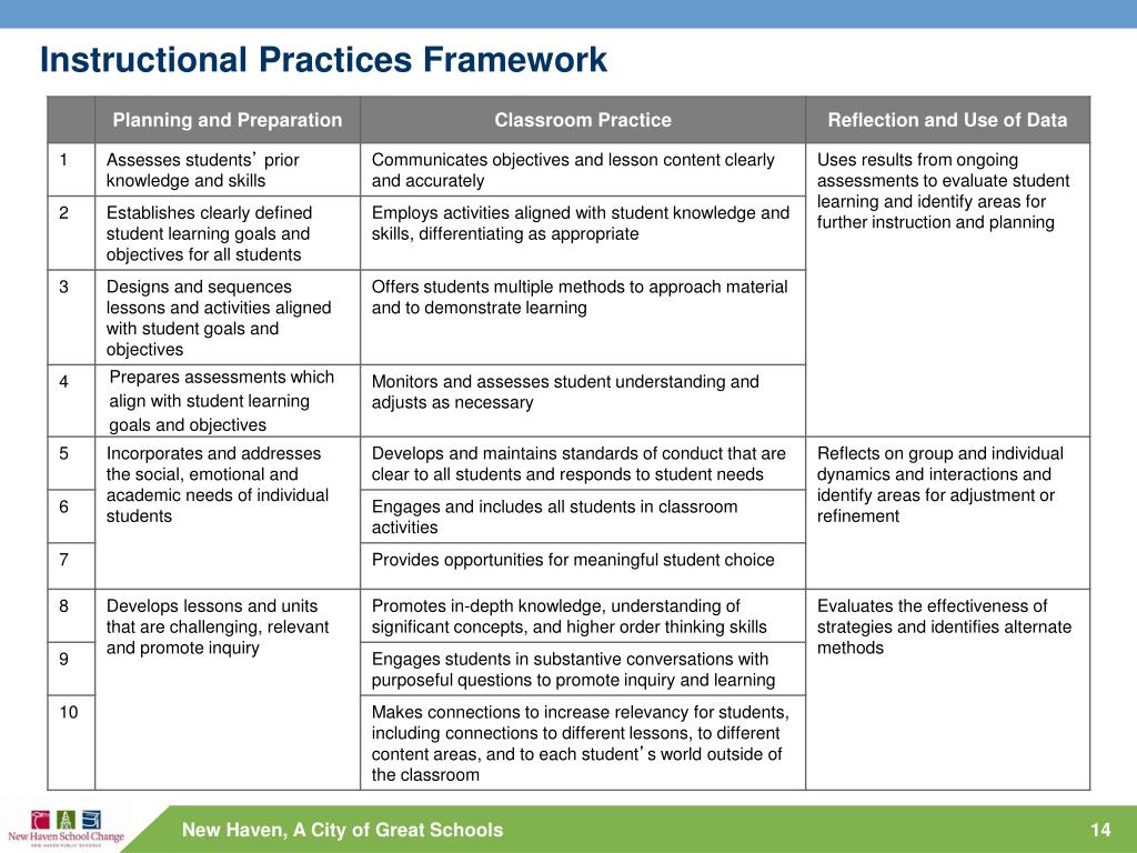 Principles of NHPS Evaluation & Development • Vision for Transforming the School System… • …Leads to Vision for Talent Management • Students learning through meaningful and coherent experiences in individual classrooms, among different classrooms, and in the rest of their lives • Schools as the centers for learning, where teams of adults take collective and empowered responsibility for students, working separately and together to move students from where ever they start to the highest performance levels, collaborating without fault • The district and schools acting to support adaptation, development, and innovation • Adults in the system will be managed as professionals to encourage collaboration, empowerment, and responsibility for outcomes, by… • Prioritizing coaching and development through professional feedback relationships with managers, using periodic conferences rather than formulaic visitations; • Encouraging managers to provide frequent and concrete feedback to staff about their performance against a clear, detailed performance rubric; • Incorporating student growth as measured by objective assessments as a factor in evaluations, in a way that encourages ownership and focus on outcomes by teachers; and • Making careful and fair consequential decisions, including validating evaluation judgments, taking 360 input on leaders, and carefully building leadership capacity