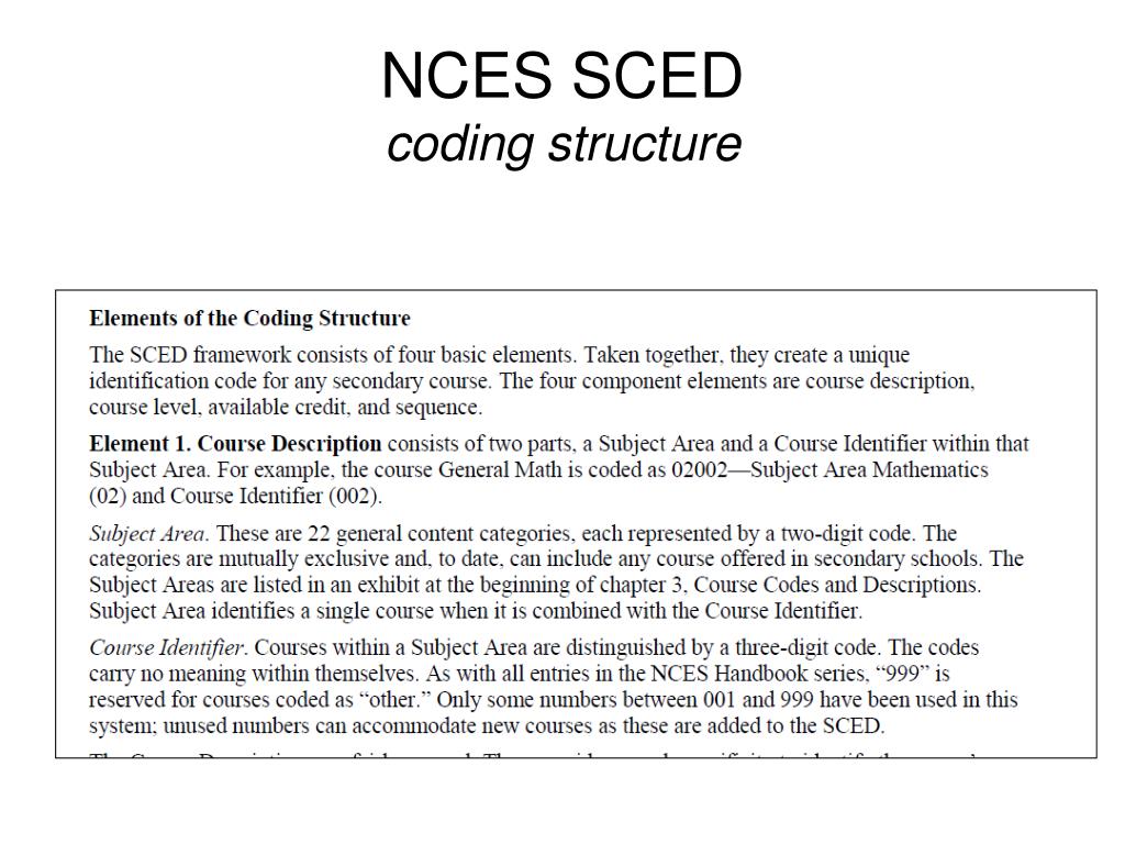 NCES SCED Since state codes were based on NCES SCED course codes, where can I see the NCES SCED documents? The NCES SCED for secondary can be found here: http://nces.ed.gov/pubsearch/pubsinfo.asp?pubid=2007341 The NCES SCED for prior-to-secondary can be found here: http://nces.ed.gov/pubsearch/pubsinfo.asp?pubid=2011801