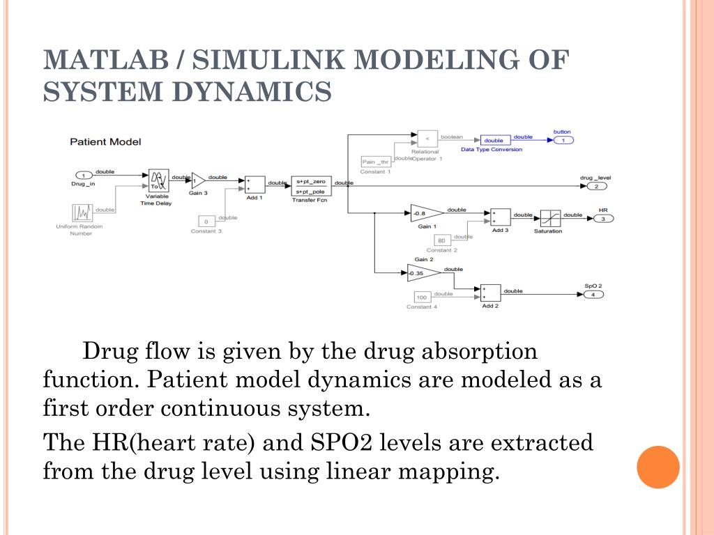 MATLAB / SIMULINK MODELING OFSYSTEM DYNAMICS Drug flow is given by the drug absorption function. Patient model dynamics are modeled as a first order continuous system. The HR(heart rate) and SPO2 levels are extracted from the drug level using linear mapping.