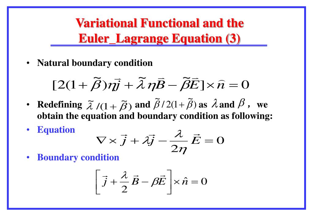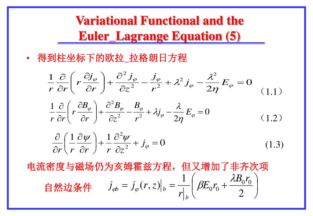 Variational Functional and the Euler_Lagrange Equation (5) • 得到柱坐标下的欧拉_拉格朗日方程 (1.1) (1.2) (1.3) 电流密度与磁场仍为亥姆霍兹方程,但又增加了非齐次项 自然边条件