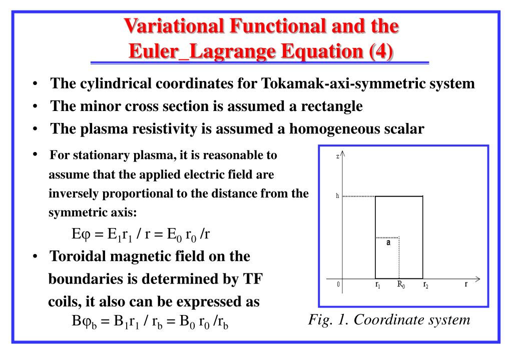 Variational Functional and the Euler_Lagrange Equation (4) • The cylindrical coordinates for Tokamak-axi-symmetric system • The minor cross section is assumed a rectangle • The plasma resistivity is assumed a homogeneous scalar • For stationary plasma, it is reasonable to • assume that the applied electric field are • inversely proportional to the distance from the • symmetric axis: • E = E1r1 / r = E0 r0 /r • Toroidal magnetic field on the • boundaries is determined by TF • coils, it also can be expressed as • Bb = B1r1 / rb = B0 r0 /rb Fig. 1. Coordinate system