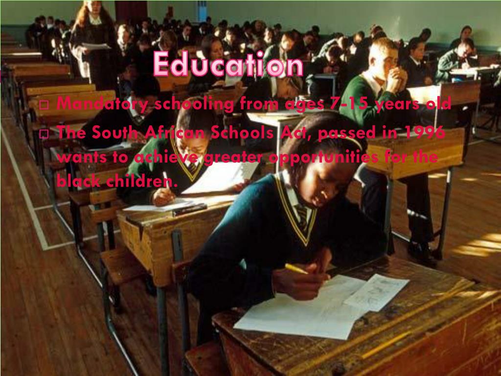 Education • Mandatory schooling from ages 7-15 years old • The South African Schools Act, passed in 1996 wants to achieve greater opportunities for the black children.