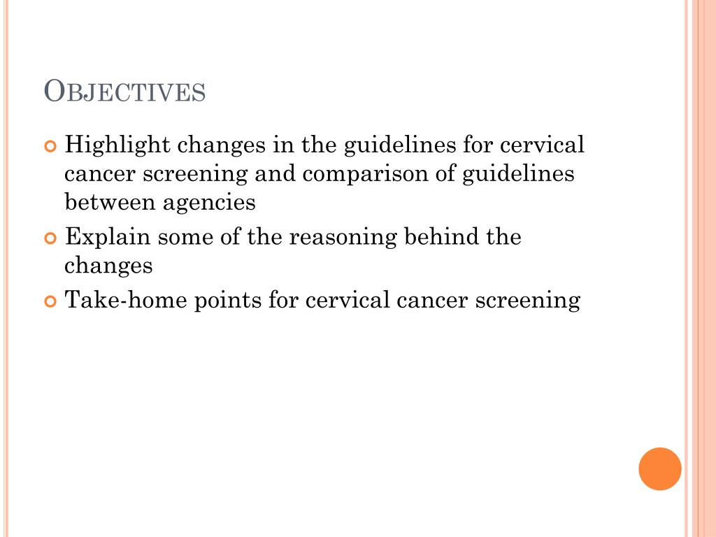 Objectives • Highlight changes in the guidelines for cervical cancer screening and comparison of guidelines between agencies • Explain some of the reasoning behind the changes • Take-home points for cervical cancer screening