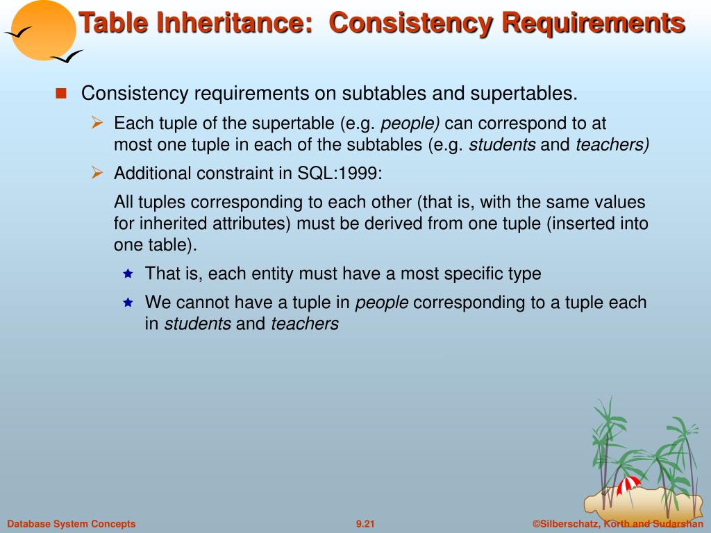 Table Inheritance: Consistency Requirements • Consistency requirements on subtables and supertables. • Each tuple of the supertable (e.g. people) can correspond to at most one tuple in each of the subtables (e.g. students and teachers) • Additional constraint in SQL:1999: All tuples corresponding to each other (that is, with the same values for inherited attributes) must be derived from one tuple (inserted into one table). • That is, each entity must have a most specific type • We cannot have a tuple in people corresponding to a tuple each in students and teachers