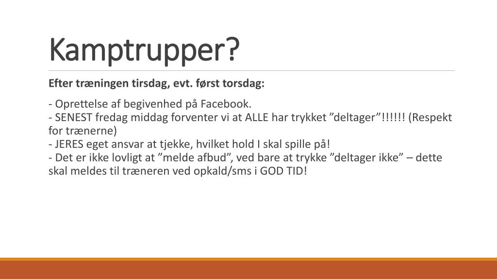 Kamptrupper? • Efter træningen tirsdag, evt. først torsdag: • - Oprettelse af begivenhed på Facebook.- SENEST fredag middag forventer vi at ALLE har trykket ”deltager”!!!!!! (Respekt for trænerne) - JERES eget ansvar at tjekke, hvilket hold I skal spille på! - Det er ikke lovligt at ”melde afbud”, ved bare at trykke ”deltager ikke” – dette skal meldes til træneren ved opkald/sms i GOD TID!