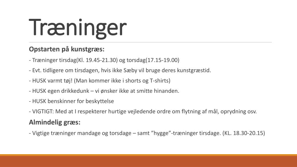 Træninger • Opstarten på kunstgræs: • - Træninger tirsdag(Kl. 19.45-21.30) og torsdag(17.15-19.00) • - Evt. tidligere om tirsdagen, hvis ikke Sæby vil bruge deres kunstgræstid. • - HUSK varmt tøj! (Man kommer ikke i shorts og T-shirts) • - HUSK egen drikkedunk – vi ønsker ikke at smitte hinanden. • - HUSK benskinner for beskyttelse • - VIGTIGT: Med at I respekterer hurtige vejledende ordre om flytning af mål, oprydning osv. • Almindelig græs: • - Vigtige træninger mandage og torsdage – samt ”hygge”-træninger tirsdage. (KL. 18.30-20.15)
