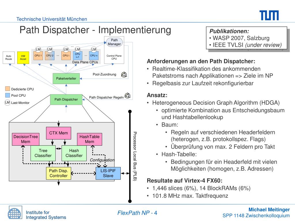 Path Dispatcher - Implementierung • Publikationen: • WASP 2007, Salzburg • IEEE TVLSI (under review) • Anforderungen an den Path Dispatcher: • Realtime-Klassifikation des ankommenden Paketstroms nach Applikationen => Ziele im NP • Regelbasis zur Laufzeit rekonfigurierbar • Ansatz: • Heterogeneous Decision Graph Algorithm (HDGA) • optimierte Kombination aus Entscheidungsbaum und Hashtabellenlookup • Baum: • Regeln auf verschiedenen Headerfeldern (heterogen, z.B. protokollspez. Flags) • Überprüfung von max. 2 Feldern pro Takt • Hash-Tabelle: • Bedingungen für ein Headerfeld mit vielen Möglichkeiten (homogen, z.B. Adressen) • Resultate auf Virtex-4 FX60: • 1,446 slices (6%), 14 BlockRAMs (6%) • 101.8 MHz max. Taktfrequenz