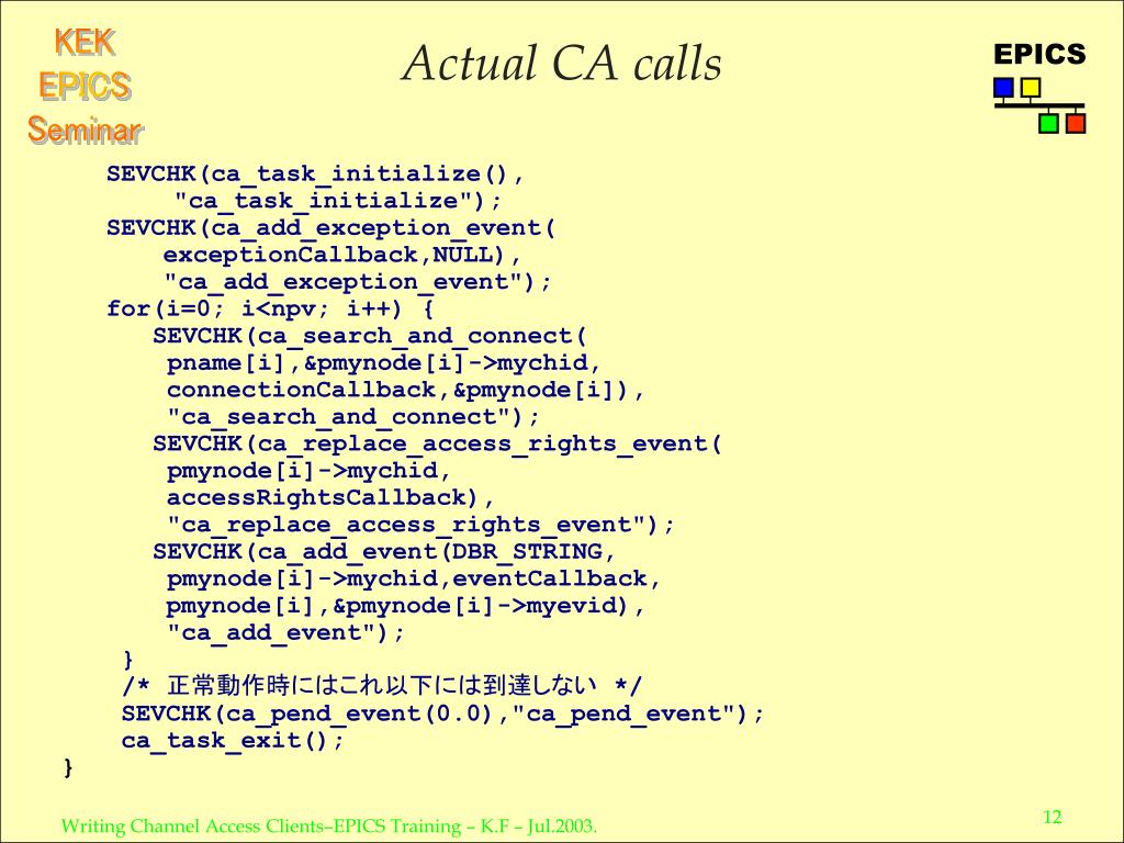 Actual CA calls SEVCHK(ca_task_initialize(), "ca_task_initialize"); SEVCHK(ca_add_exception_event( exceptionCallback,NULL), "ca_add_exception_event"); for(i=0; i<npv; i++) { SEVCHK(ca_search_and_connect( pname[i],&pmynode[i]->mychid, connectionCallback,&pmynode[i]), "ca_search_and_connect"); SEVCHK(ca_replace_access_rights_event( pmynode[i]->mychid, accessRightsCallback), "ca_replace_access_rights_event"); SEVCHK(ca_add_event(DBR_STRING, pmynode[i]->mychid,eventCallback, pmynode[i],&pmynode[i]->myevid), "ca_add_event"); } /*正常動作時にはこれ以下には到達しない*/ SEVCHK(ca_pend_event(0.0),"ca_pend_event"); ca_task_exit(); }